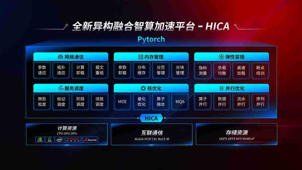 通过自研的服务层、、中间适配层、、、、以及调度编排算法,,,采用数据并行、、、模型并行等多种并行方式,,,,把并行计算任务进行有效的分解,,使其分别由相应的软件栈和算力资源来承接。。。。当GPU资源变化,,,,HICA可以实时动态调度计算子任务并调整模型拓扑和架构,,以充分聚合各种算力资源。。。